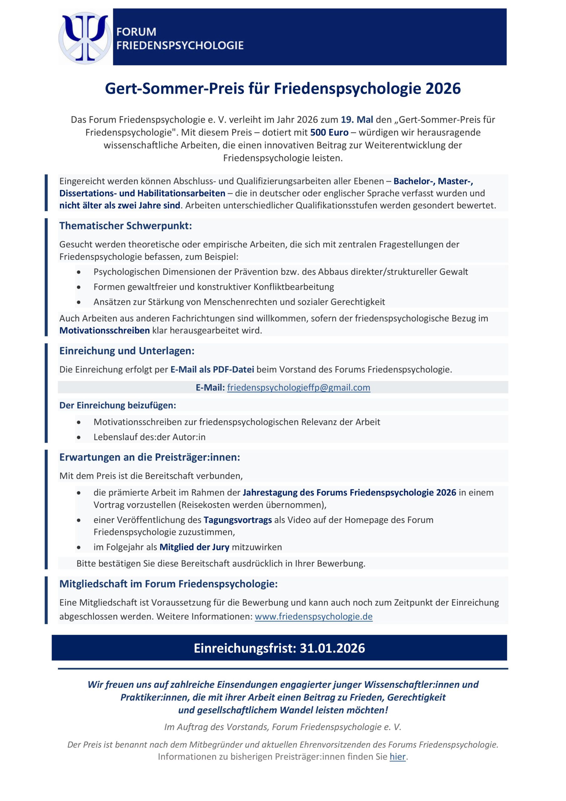 Nach großartigen Gewinnerinnen und Gewinnern in den vergangenen Jahren suchen wir auch für 2026 wieder eine würdige wissenschaftliche Arbeit, die sich einem friedenspsychologischen Thema auf innovative, detailreiche oder besonders durchdachte Weise nähert.